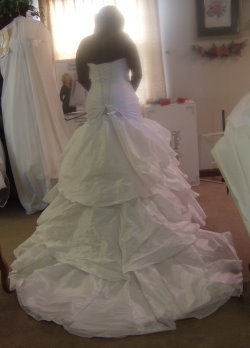 The above dress is a picture of a pick up style wedding dress that was bustled using the outer bustle. This is a bustle that has to styles combined. Here you see and American bustle style combined with French bustle.
