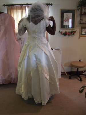 "This dress had a beautiful ruffled train. This dress was bustled under the top ruffle using an American bustle."