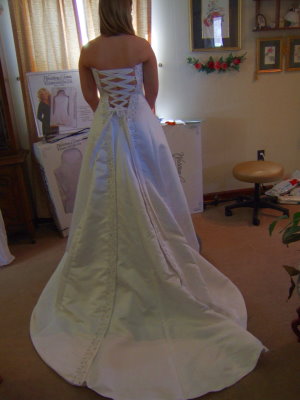"Now this gown had beautiful pink bands decorating the back of the train. I wanted to make sure that showed off once bustled. The result is what you see above. The bride was thrilled!"