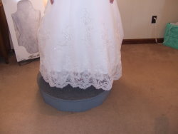 Multi-layer gowns like tulle wedding dresses, are expensive to hem, because you have to line up the layers and cut them so that they fall as evenly as possible. Or you have to hem it from the waistline.