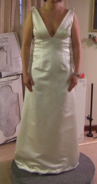 The finished product at pick up.What should you expect to happen at your gown fitting? You will be asked what you feel need to be done to the gown. Then you will be fitted working from the top down. Your shoulder area will be done first. Then your neckline will follow.