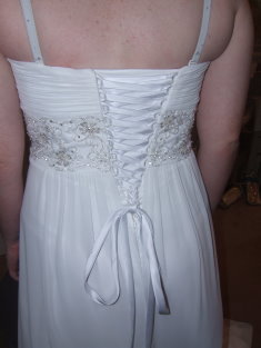 "This bride was pregnant. The amount of separation you see spread apart for each side of the dress, is how much of her back was exposed. She had a zipper closure. To fix this... I took the zipper out and converted this to a lace up back closure with a modesty panel. The bride was delighted with the results."