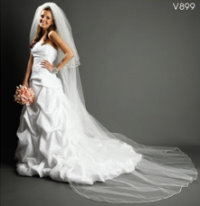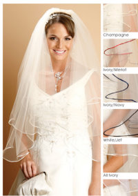 If you have a lot going on already on your dress... you may not want to over do it by adding a veil with a lot of detail on it. A wedding veil design with just a cut edge or simple edging like the pencil edge, ribbon, cording would be all that is needed. A simple single row of beads or crystals will also work.